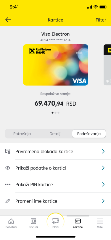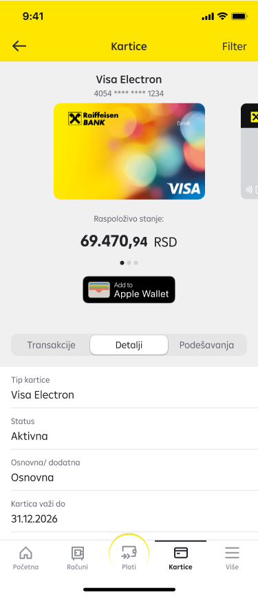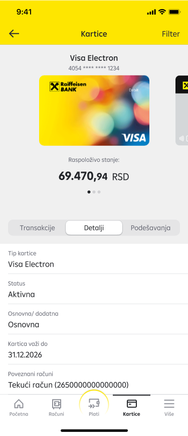 - Detalji– informacije o tipu kartice, statusu, vlasniku, datum važenja i informacije o računima za koje je kartica vezana.